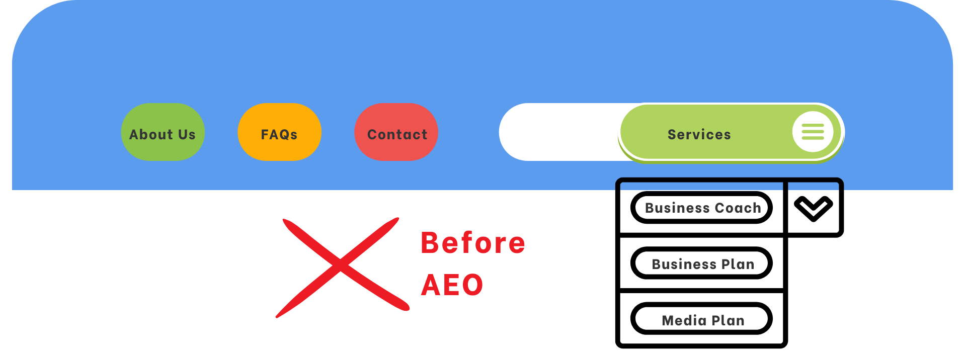 Here is a special tip for SMEs (Small and Medium Enterprise): To help AI "catch the signal" of your website, instead of bundling various product sub-tabs into a single main tab, you should separate each product into its own primary tab (as shown in the illustration). With this layout, AI can rapidly discover your content, ensuring your website appears in the top 1 or 2 spots when the AI responds to customers.