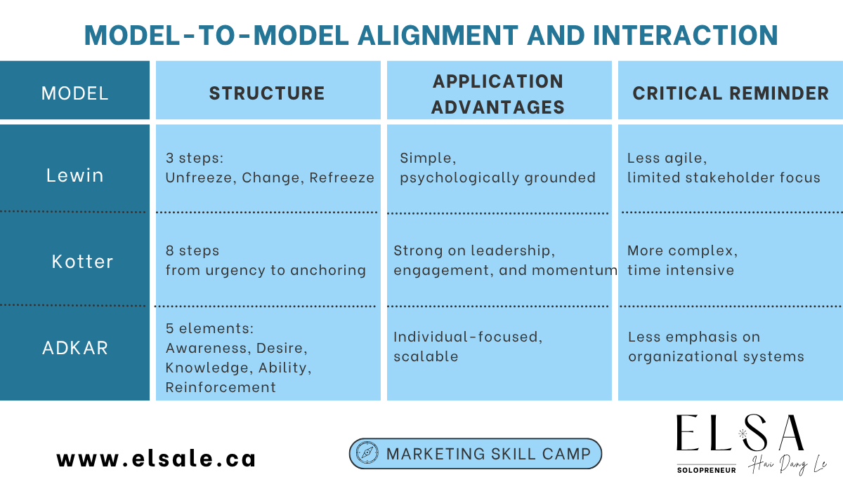Lewin’s model is ideal for foundational change. Kotter’s suits large-scale transformations, while ADKAR excels in personal and team-level shifts.